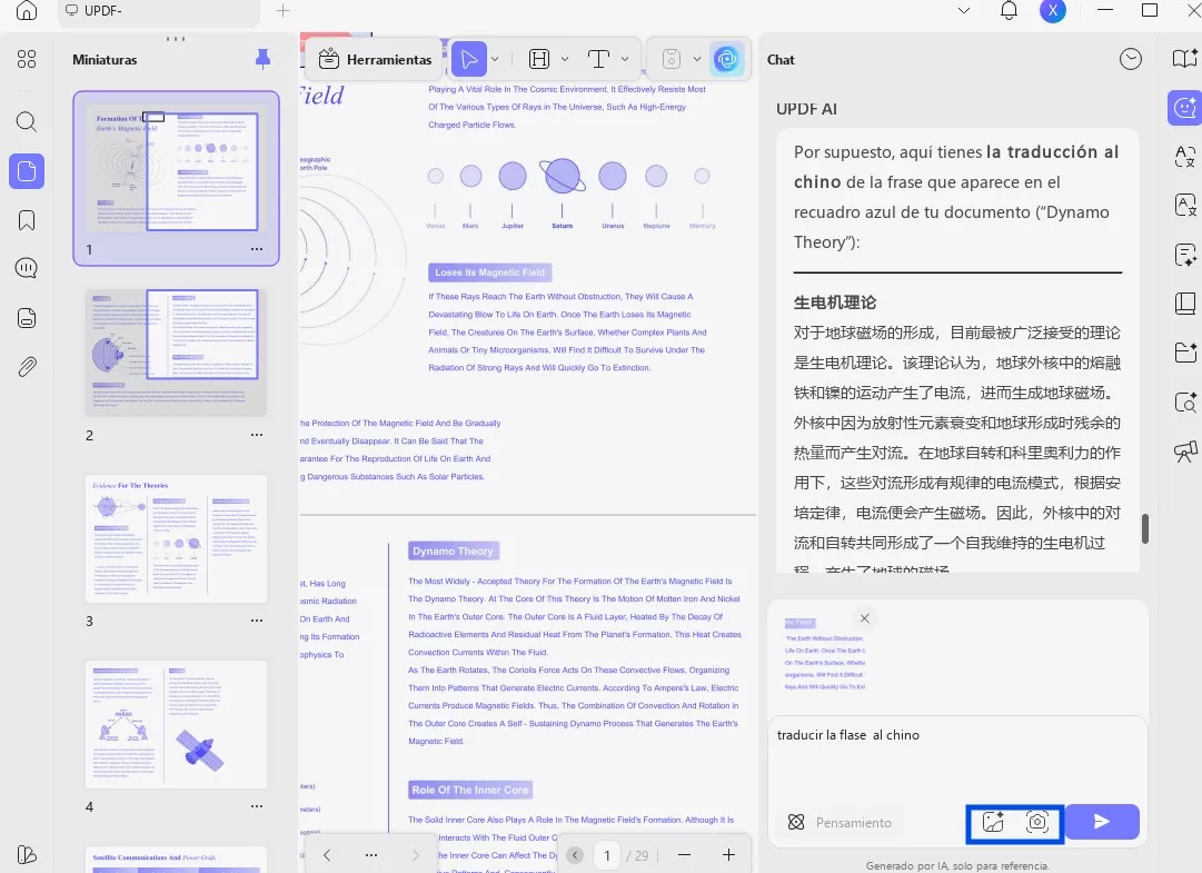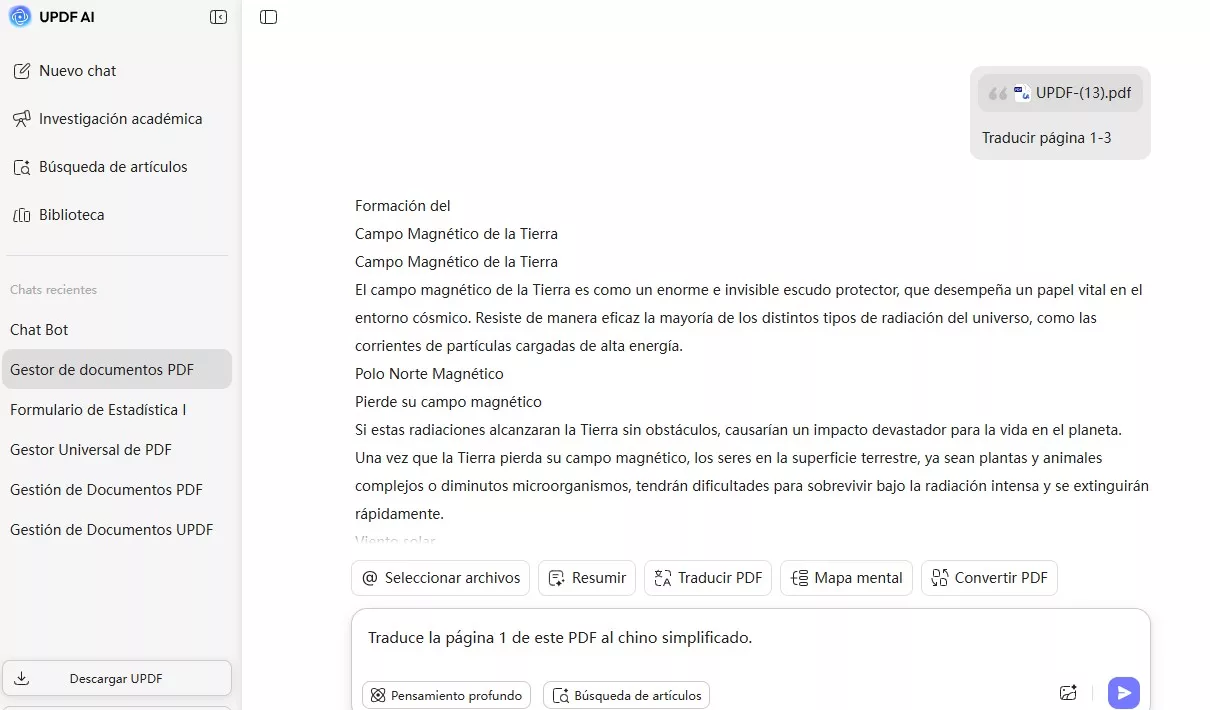 Si buscas un enfoque más interactivo y flexible, el método del cuadro de chat es tu mejor opción. Esta función te permite hacer consultas específicas relacionadas con la traducción, lo que facilita la selección de secciones específicas o la extracción de información en un idioma diferente.