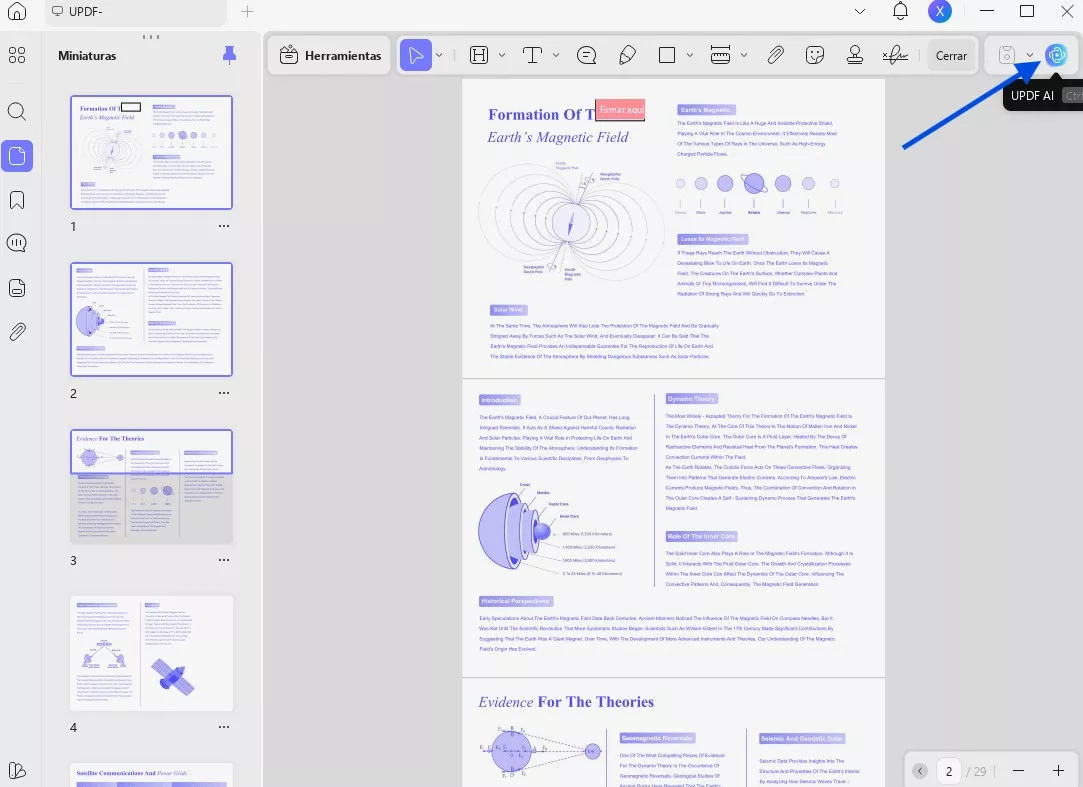 Paso 2. Una vez abierto el PDF, verás esta interfaz. Haz clic en el botón «AI» situado en la esquina superior derecha de la pantalla.