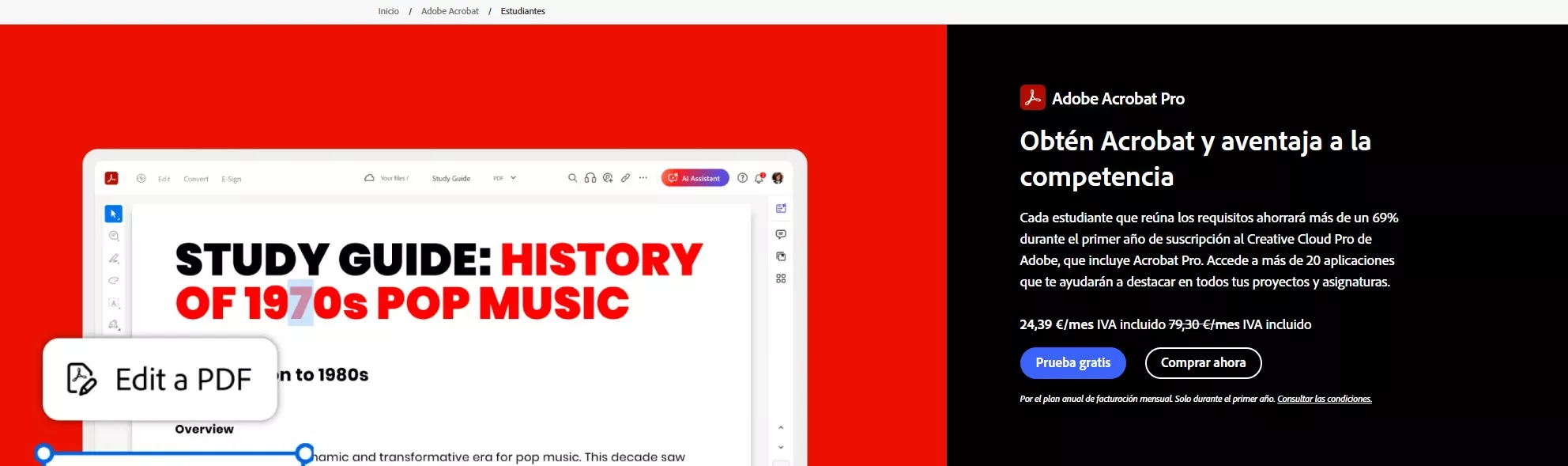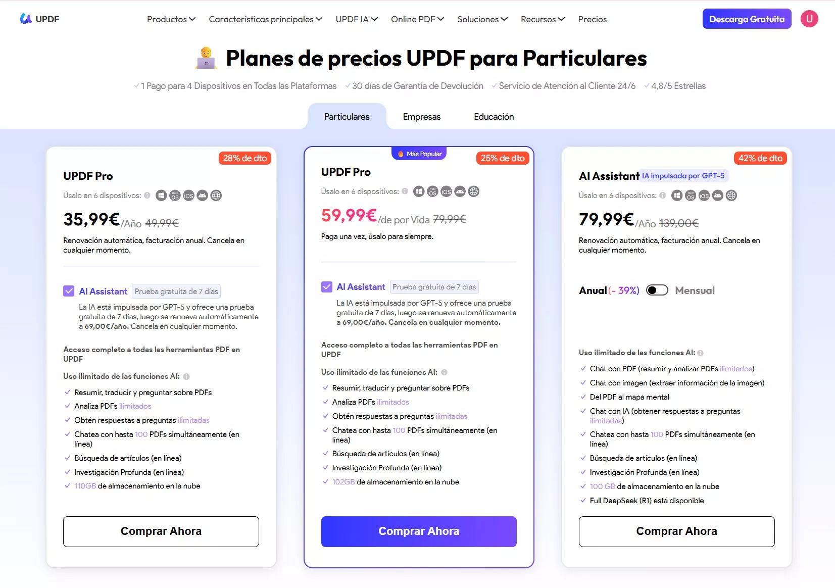 UPDF es una de las alternativas a Adobe Acrobat más baratas del mercado. Solo cuesta 35.99€ al año, mientras que Adobe Acrobat Pro puede costar más de 294.76€ $ al año con una suscripción mensual. Es un ahorro enorme. ¡Y todo ello sin renunciar a las funciones clave! Puede consultar la comparación entre UPDF y Adobe Acrobat para tomar una decisión.