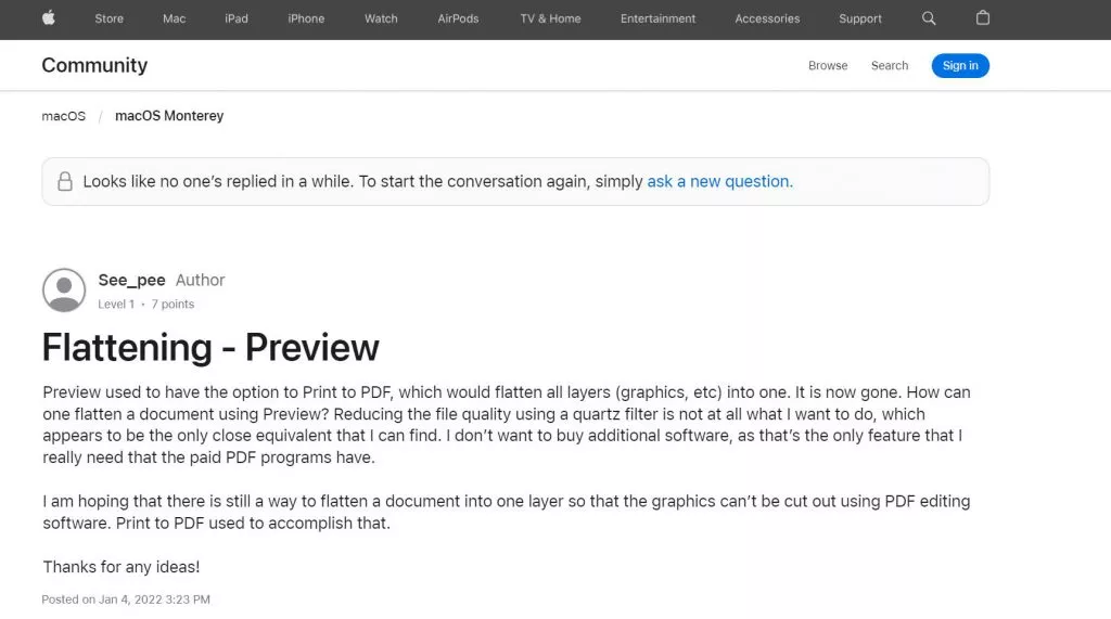 Por otro lado, Vista Previa es un visor de PDF sencillo y no resulta confiable para tareas complejas. Durante nuestra investigación, observamos que, dentro de la comunidad de Apple, varios usuarios han comentado que la función de aplanamiento de Vista Previa ha dejado de funcionar correctamente recientemente.