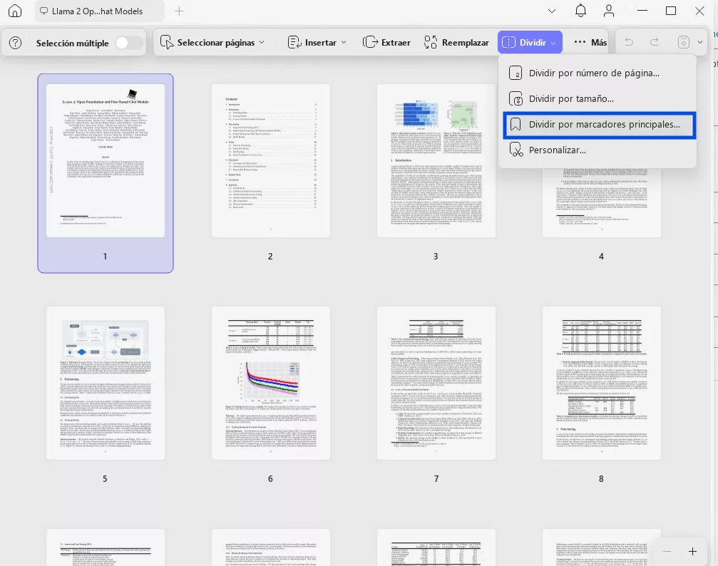 Instrucciones. Accede a la función "Dividir documento" y elige la opción "Marcadores de nivel superior" entre los métodos de división. En la página siguiente, pulsa el botón "Dividir" para crear fácilmente archivos PDF separados según el número de marcadores del archivo original.