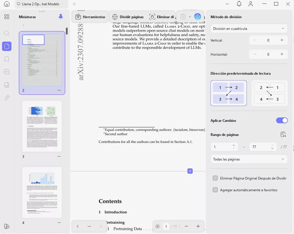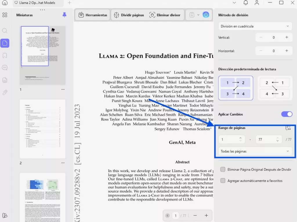 Instrucciones. Después de importar el libro deseado a esta herramienta, vaya a la herramienta "Dividir" en "Herramientas". A continuación, establezca el rango de páginas y otros ajustes según sus necesidades. Por último, pulse el botón "Aplicar" para dividir las páginas en archivos individuales sin problemas.