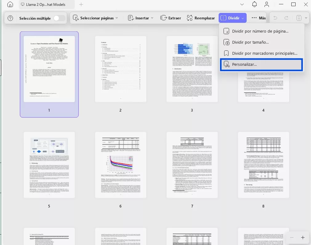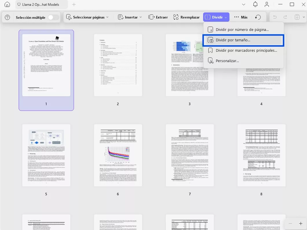 Este método es eficaz cuando necesitas crear un documento dividido de manera uniforme sin seleccionar manualmente las páginas. Los usuarios pueden dividir un archivo PDF grande en archivos más pequeños basándose en un número determinado de páginas.