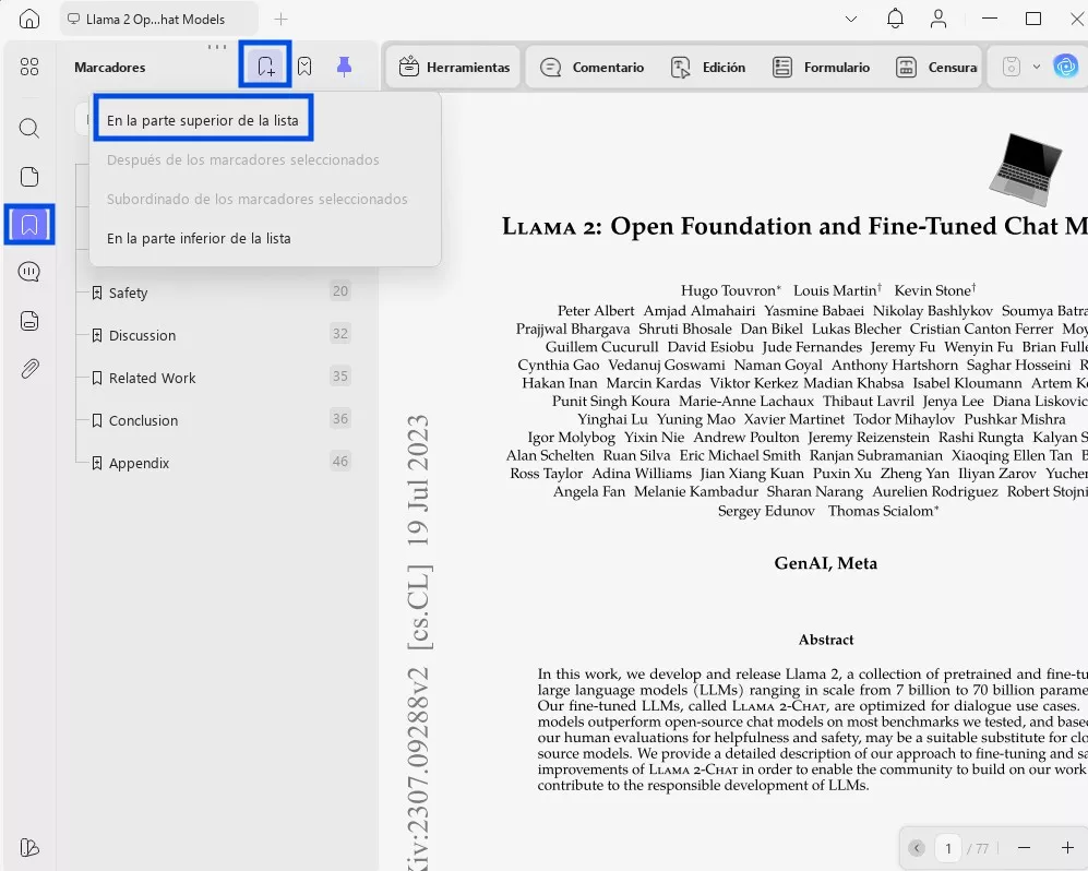 Paso 1. El proceso comienza con la adición de marcadores, y para ello, debe dirigirse al modo "Comentario"desde "Herramientas". En el mismo panel, pulse el icono "Marcador" y toque el icono "+" para mostrar un menú desplegable. Elija la opción "En la parte superior de la lista" para añadir marcadores a su PDF según los números de página.