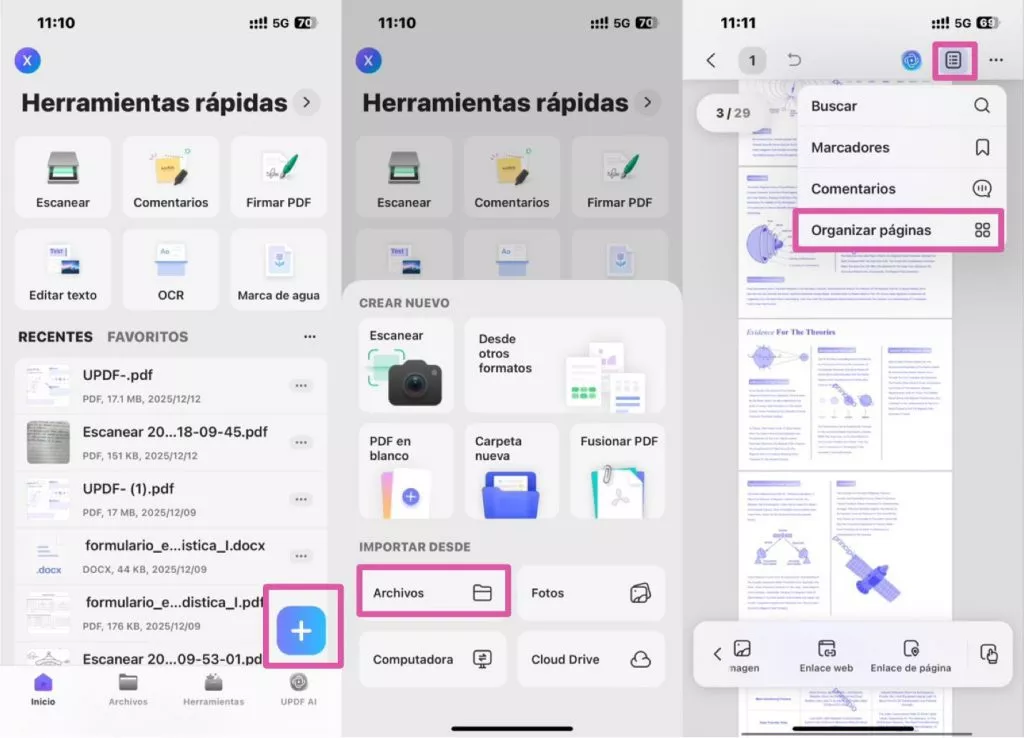 Paso 1. El primer paso es descargar la aplicación UPDF en tu iPhone y, a continuación, desde su interfaz principal, pulsar el botón «+». En el menú que se abre de abajo hacia arriba, selecciona la opción "Archive"para añadir el PDF que desees a la aplicación. Una vez añadido el documento, amplía el menú de herramientas y selecciona la opción "Organizar páginas" de la lista.