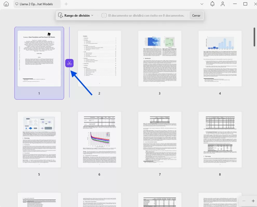 Paso 2. Mueva el cursor, que se simboliza como un cortador, para colocarlo entre las páginas que desea dividir. Por último, pulse el botón "Dividir" para finalizar el proceso y dividir las páginas en documentos individuales.