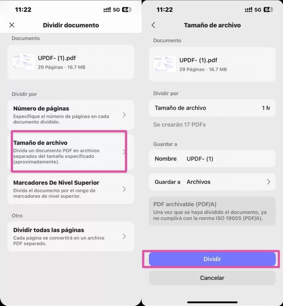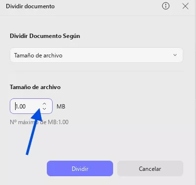 Otro método sencillo es dividir por tamaño, lo cual es ideal cuando necesitas dividir un PDF grande en archivos más pequeños en términos de tamaño. Por lo tanto, descubre cómo dividir automáticamente archivos PDF en varios archivos con la guía que te ofrecemos: