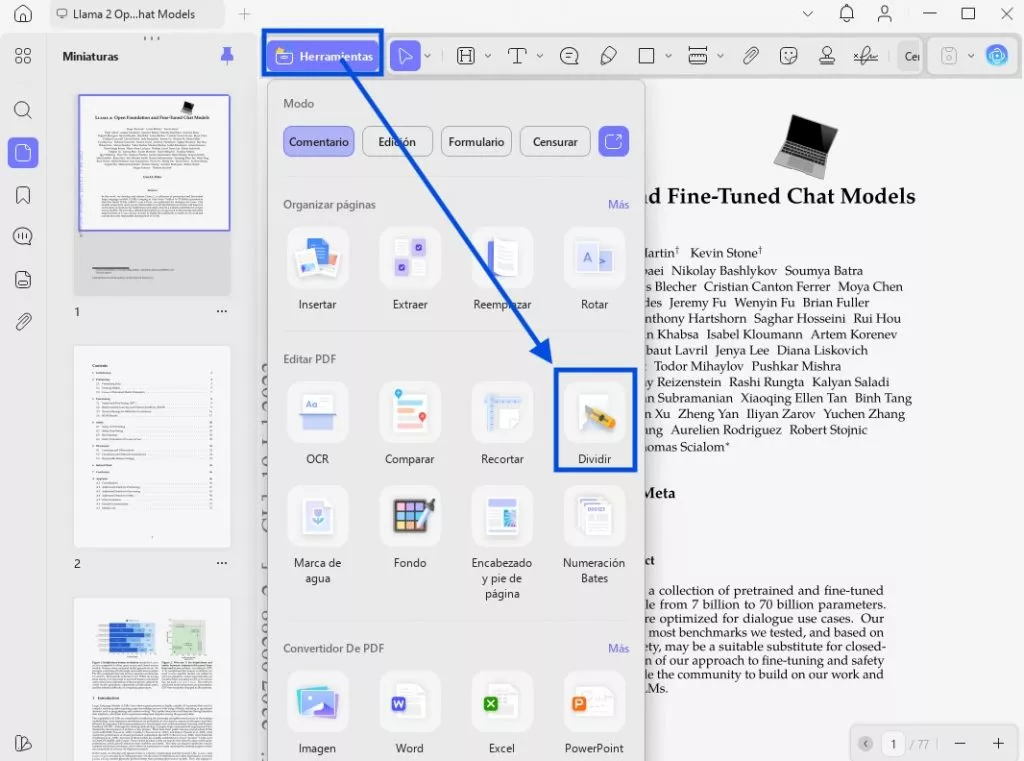 Paso 2. Una vez importado el documento, vaya al icono "Herramientas" y seleccione "Dividir" para ver más opciones. En el menú emergente, configure los ajustes según sus necesidades.