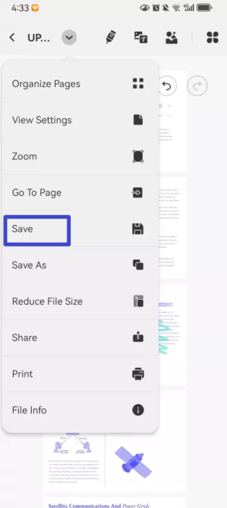 Cuando todas las anotaciones requeridas se hayan completado, toca el botón “Cerrar”, eso cerrará las herramientas de anotación. Luego de esto, selecciona el ícono de “Tres puntos” y selecciona la opción “Guardar”. Luego de esto, tu PDF con anotaciones será guardado en tu dispositivo Android.