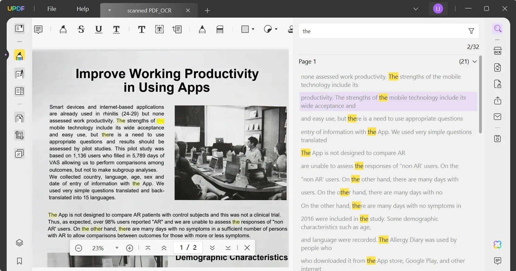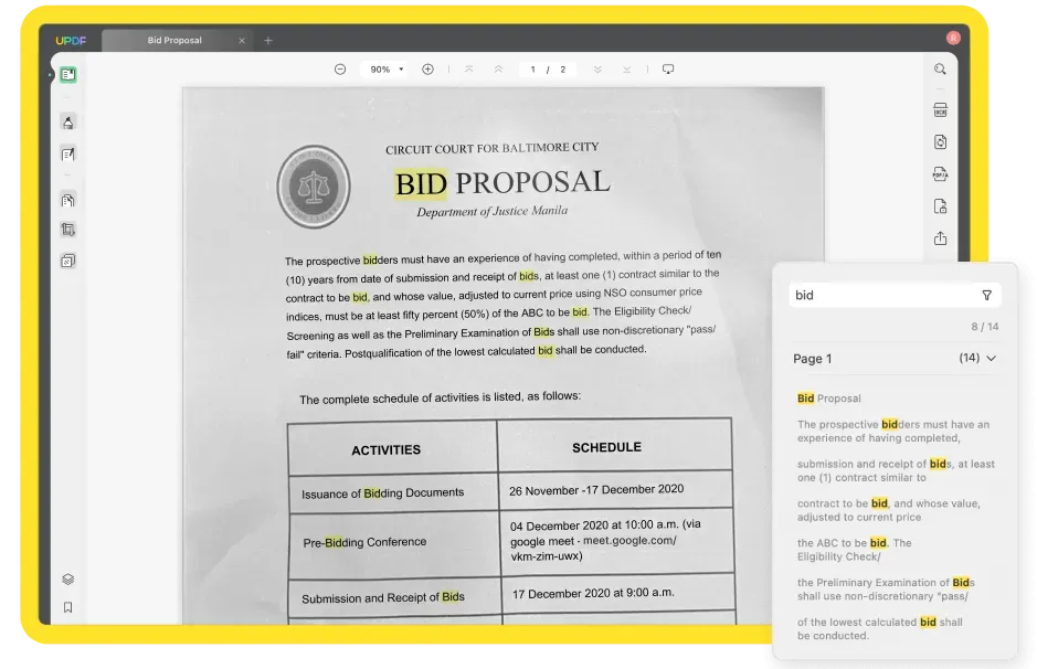 Después de realizar OCR, el archivo PDF en el que se pueden realizar búsquedas se abrirá automáticamente en UPDF. Ahora, puedes buscar palabras en PDF escaneado que deseeshaciendo clic en Ctrl + F o en el icono Buscar de la esquina superior izquierda.