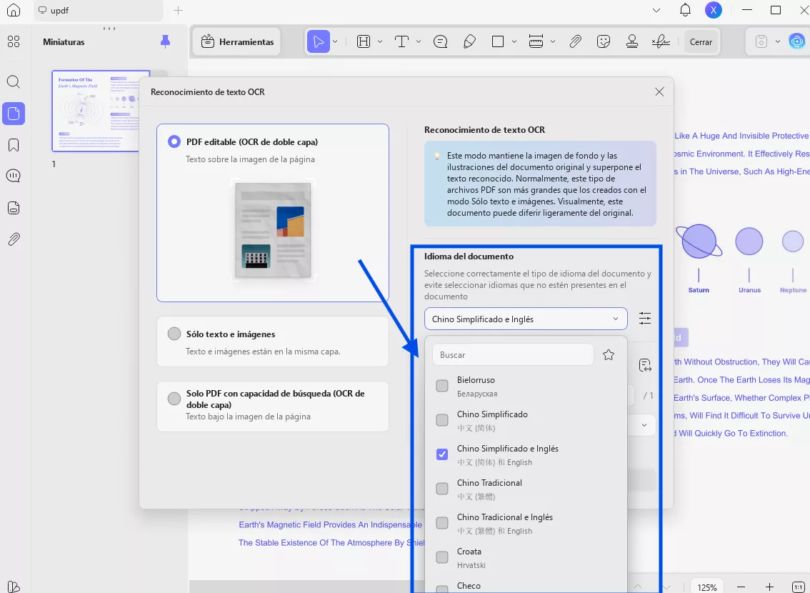 UPDF ofrece una tecnología OCR fiable que admite 38 idiomas. Cuando el documento escaneado contiene varios idiomas, puede seleccionar los idiomas pertinentes en la configuración de idioma mientras realiza el OCR en la versión de escritorio o móvil de UPDF. A continuación, el OCR de UPDF reconocerá los distintos idiomas y convertirá el texto escaneado en texto seleccionable y buscable según corresponda.