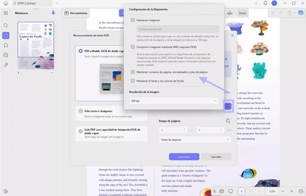 - Revise la configuración de OCR: Seleccione el idioma correcto del documento, el diseño y el tipo de salida. Configuraciones incorrectas pueden causar problemas en el reconocimiento del texto.