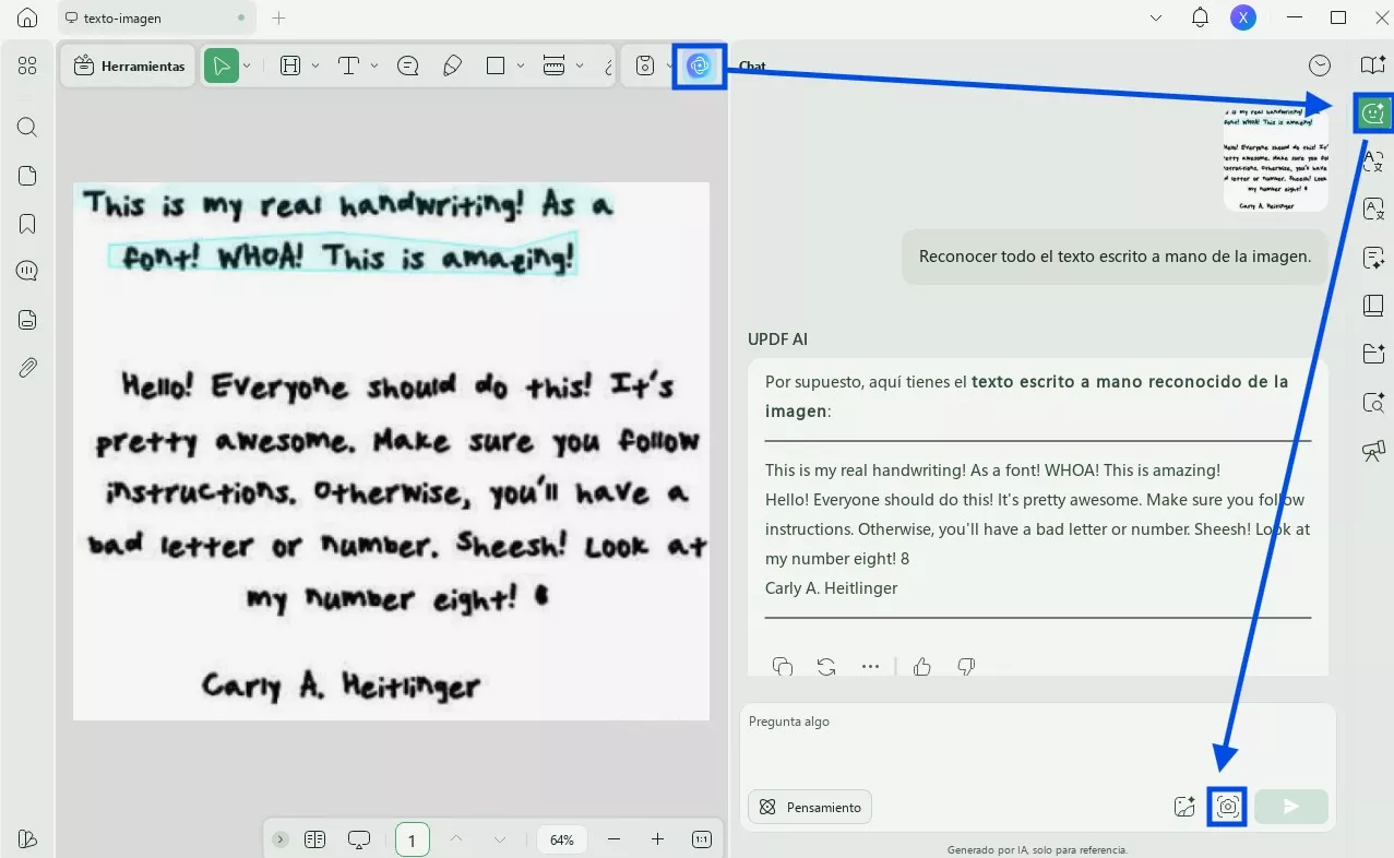 Pasos para reconocer texto manuscrito con el asistente de IA en línea de UPDF