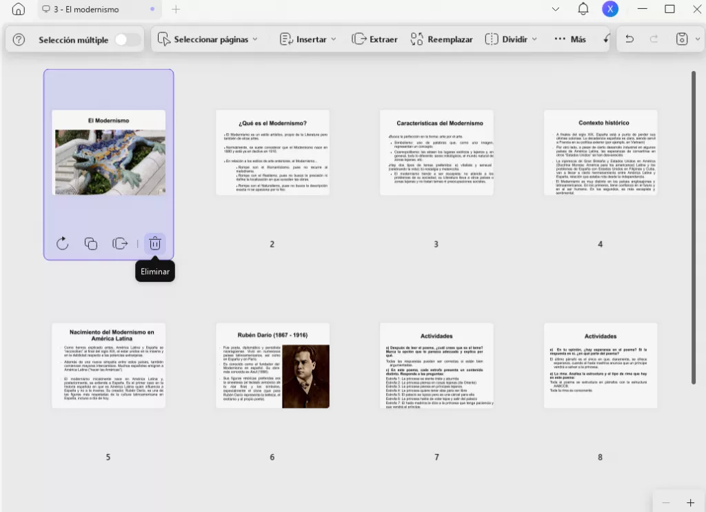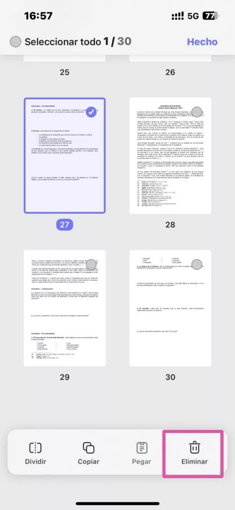 • Toca Eliminar para eliminar las páginas seleccionadas.