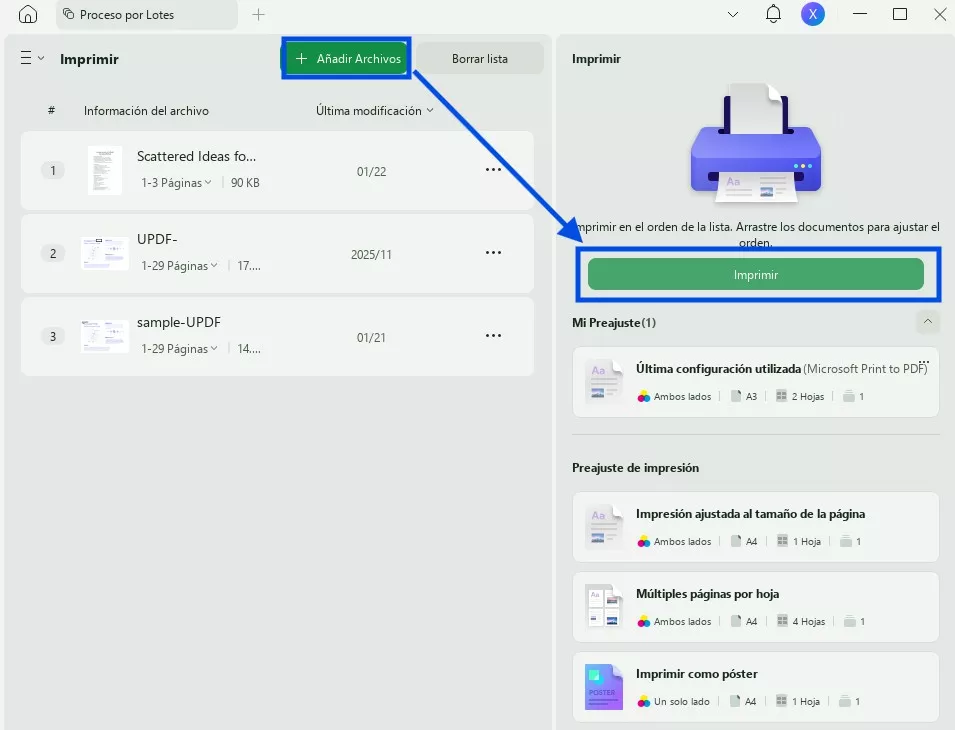 Si necesita imprimir grandes volúmenes de archivos PDF con comentarios, puede utilizar la función de impresión por lotes de UPDF. Esta función le permite imprimir varios archivos PDF a la vez, lo que le ayudará a ahorrar mucho tiempo y esfuerzo.