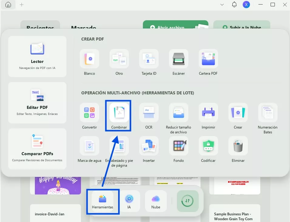 Paso 3: Ahora, puede imprimir el documento de comentarios exportado si solo necesita las partes con comentarios. Para aquellos que necesitan tener los comentarios junto con UPDF, pueden hacer clic en "Herramientas" en la interfaz de inicio y seleccionar "Combinar", luego hacer clic en "Añadir archivos" para cargar el PDF original y el PDF con comentarios, y hacer clic en "Aplicar" para combinarlos. Una vez hecho esto, puede imprimir el PDF combinado.