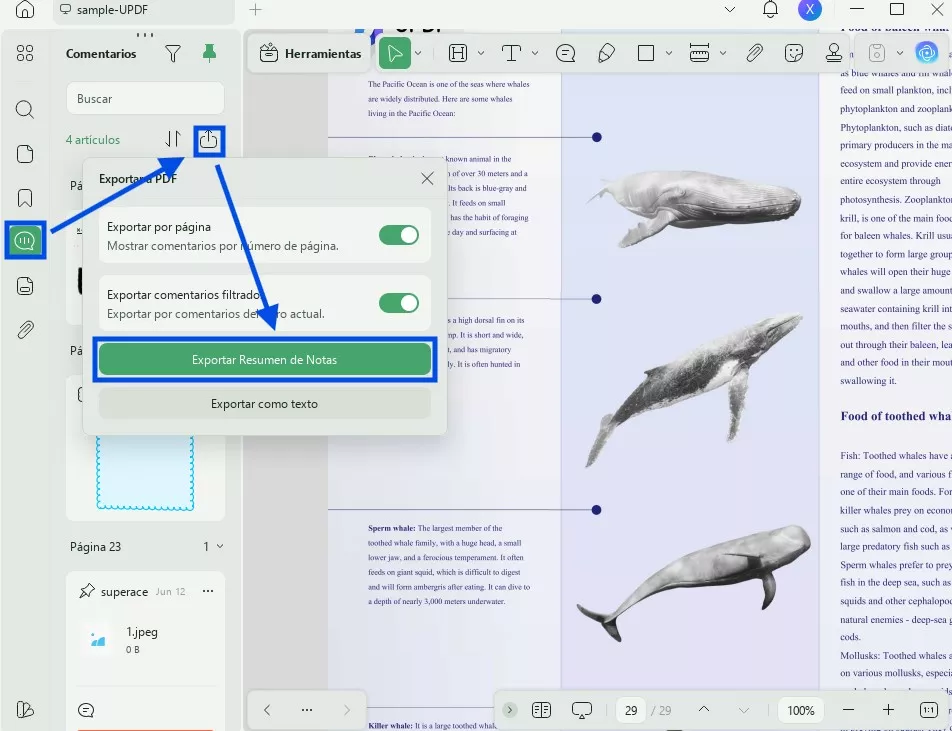 Paso 2: Abra "Comentarios" en la parte inferior derecha, haga clic en el icono "Exportar PDF" en la esquina superior derecha y haga clic en "Exportar resumen de notas" para exportar las notas adhesivas y los comentarios ocultos al PDF.