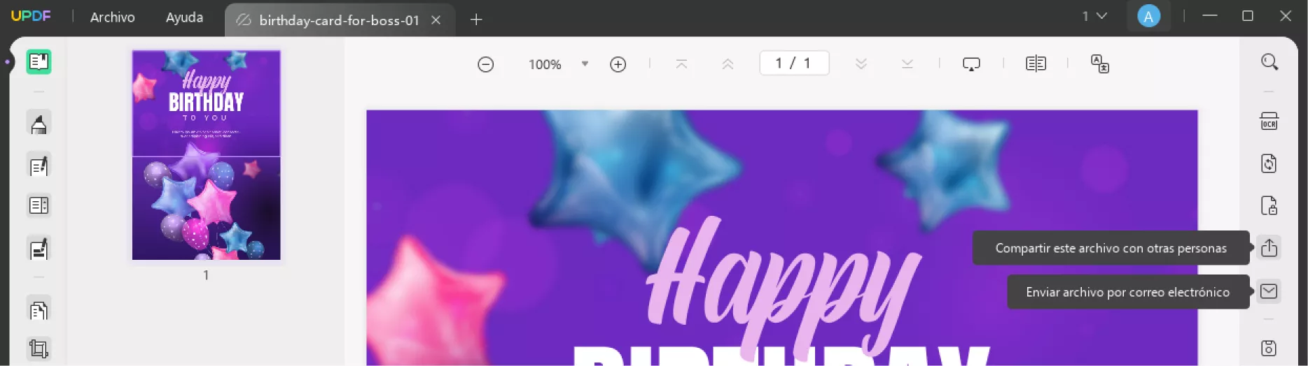 Elegir una felicitación de cumpleaños divertida para tu jefe no es el final. Para sorprenderlo, puedes descargar UPDF y la tarjeta de felicitación en PDF que aparece a continuación para añadirle el mensaje divertido.