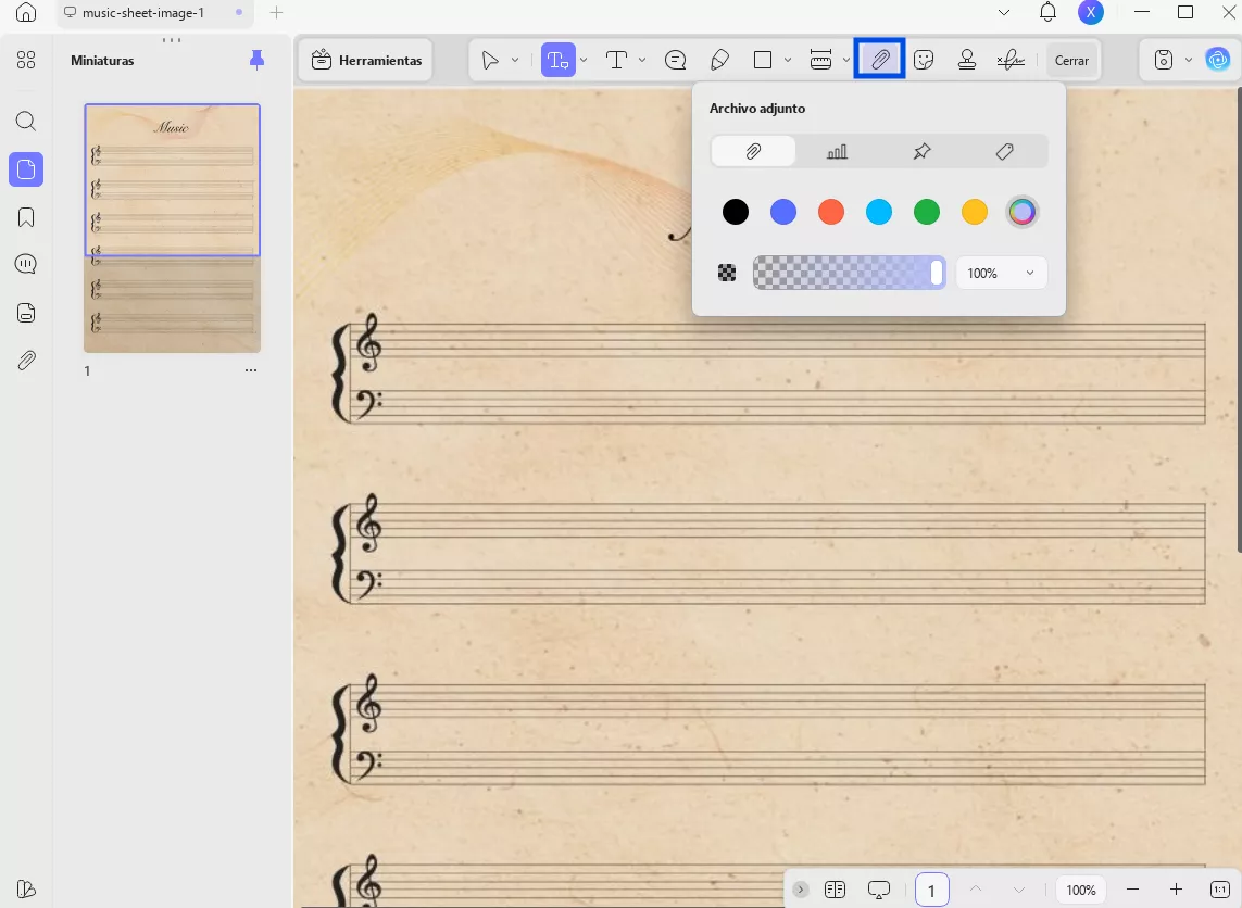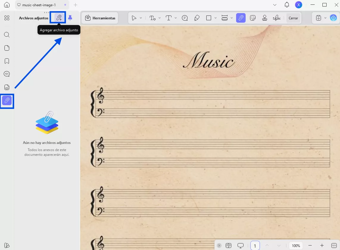 Si desea añadir la música directamente a su plantilla PDF de partitura en blanco, puede seguir estos dos métodos utilizando la función de adjuntar archivos de UPDF: