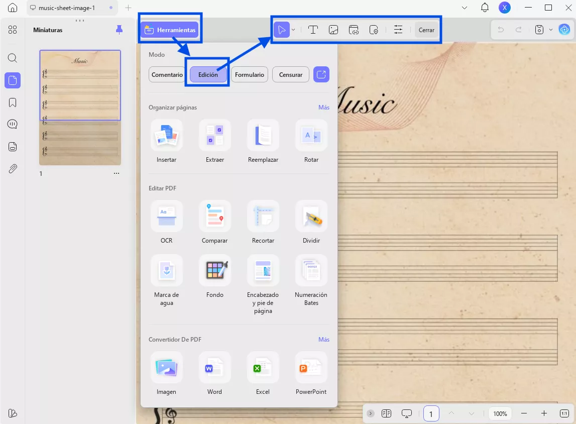 A continuación, haz clic en el modo Editar en Herramientas, disponible en la parte izquierda de la interfaz principal de esta herramienta de gestión. Ahora, haz clic en cualquier campo editable de la plantilla para editar la plantilla PDF de partitura en blanco según tus gustos y necesidades. Después, pulsa la opción Texto para añadir algo a la plantilla, como símbolos musicales, y luego arrástralo al área requerida de la plantilla.