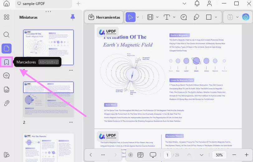 Abra su documento PDF en UPDF y haga clic en el icono «Marcadores» en la barra lateral izquierda.