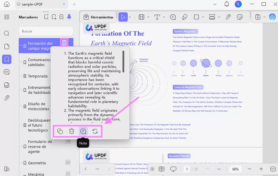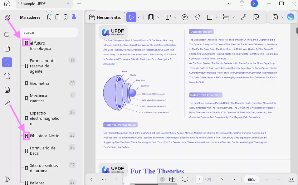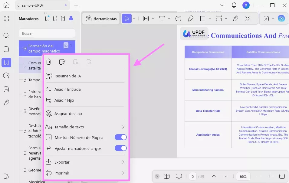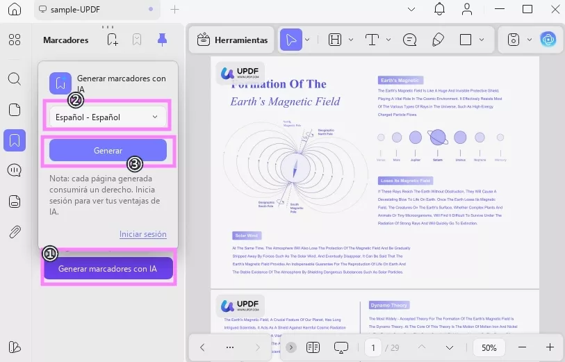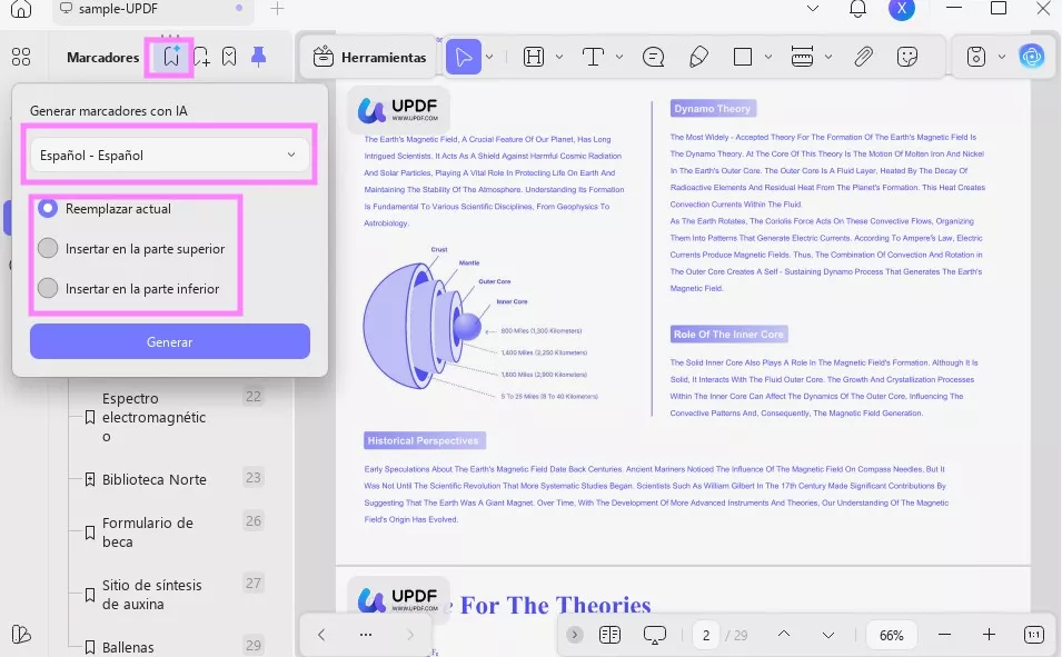 La función de marcadores generados por IA de UPDF detecta automáticamente los encabezados y la jerarquía de su documento para crear marcadores principales y secundarios. Además, puede generar marcadores en varios idiomas, traducir los marcadores existentes y personalizarlos.