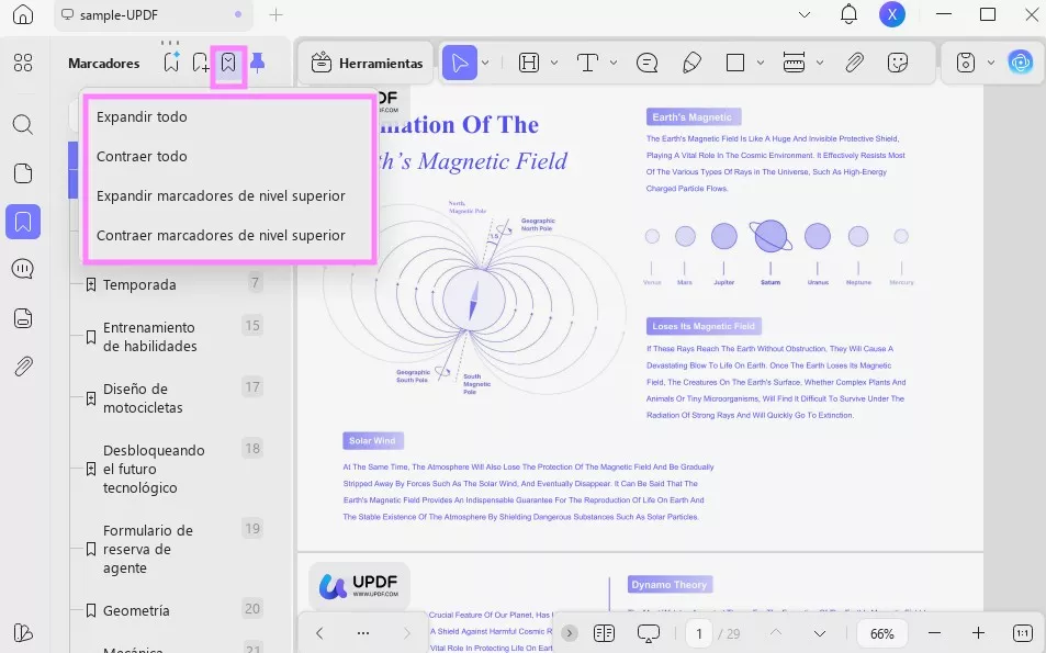 - Expandir marcadores de nivel superior: expande solo los marcadores principales y mantiene los submarcadores fuera de la vista.