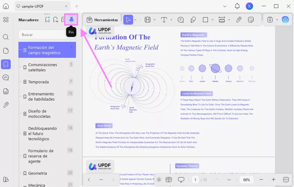 También puede mantener el panel de marcadores fijo y visible mientras trabaja en el documento. Para ello, haga clic en el icono «Fijar» situado en la parte superior. De este modo, podrá revisar el documento y gestionar los marcadores al mismo tiempo.