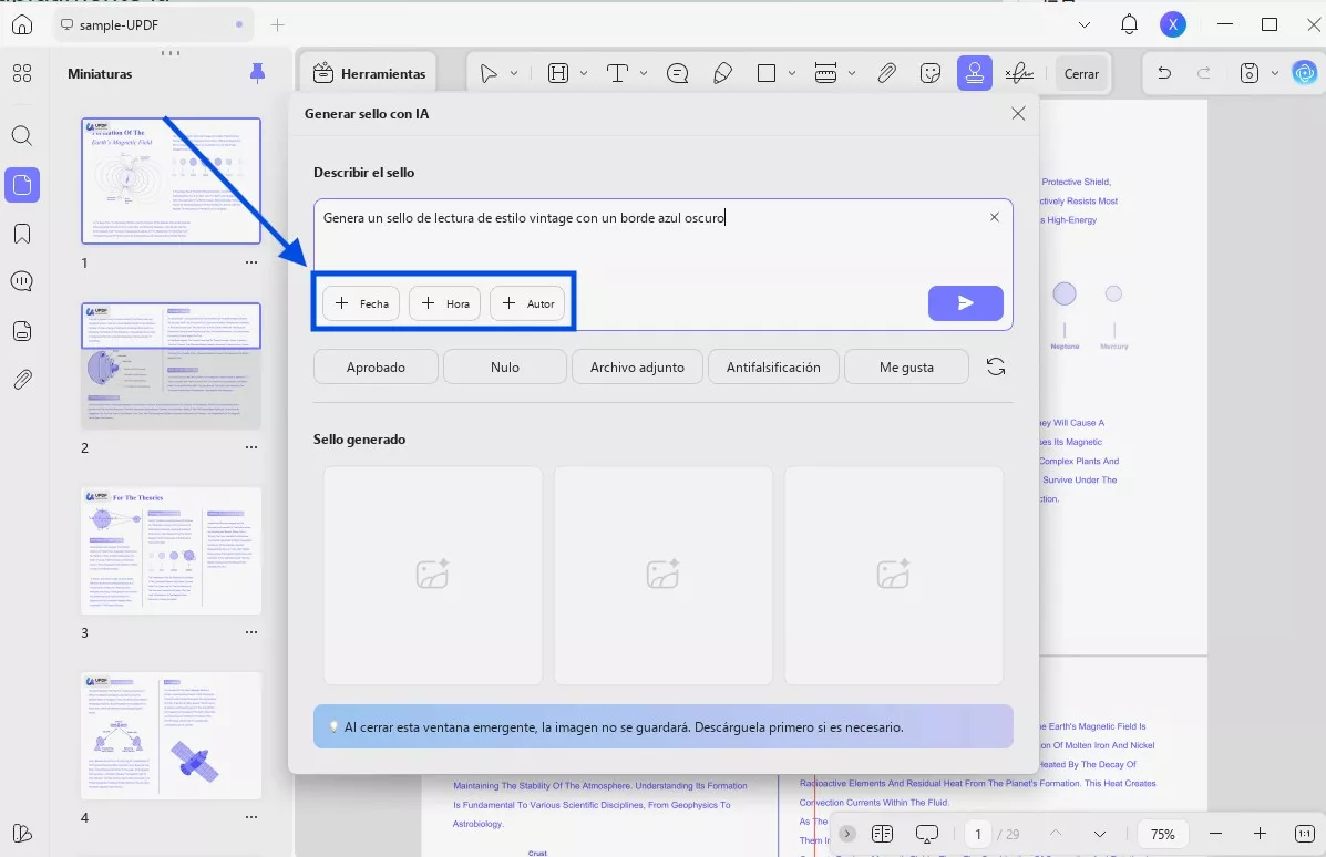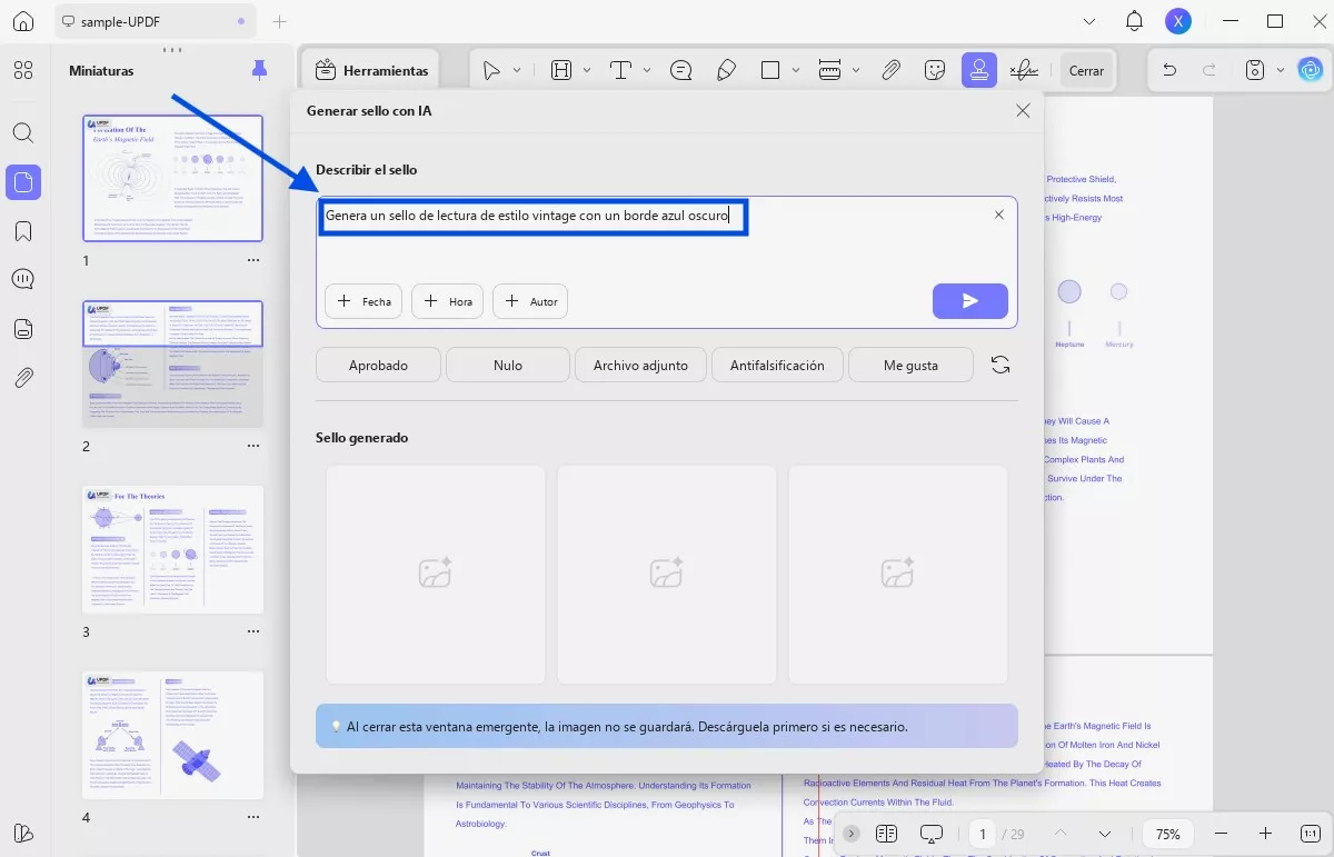 Además de escribir manualmente la descripción de un sello, UPDF también te permite generar sellos utilizando opciones de sugerencias preestablecidas. Dependiendo del sello preestablecido que elijas, la IA añade automáticamente una descripción sugerida para generar el sello correspondiente. Así, no tienes que pensar en ello ni escribirlo tú mismo.