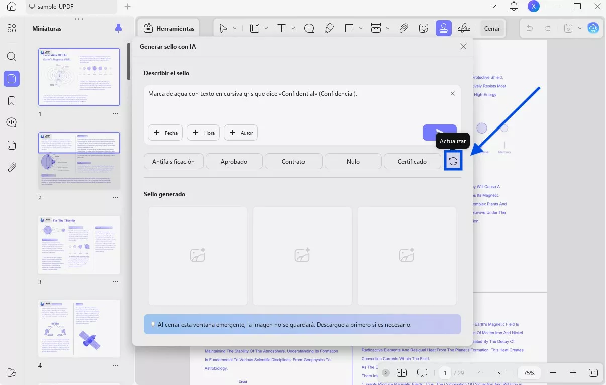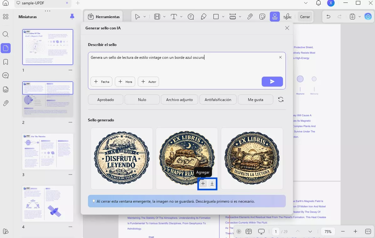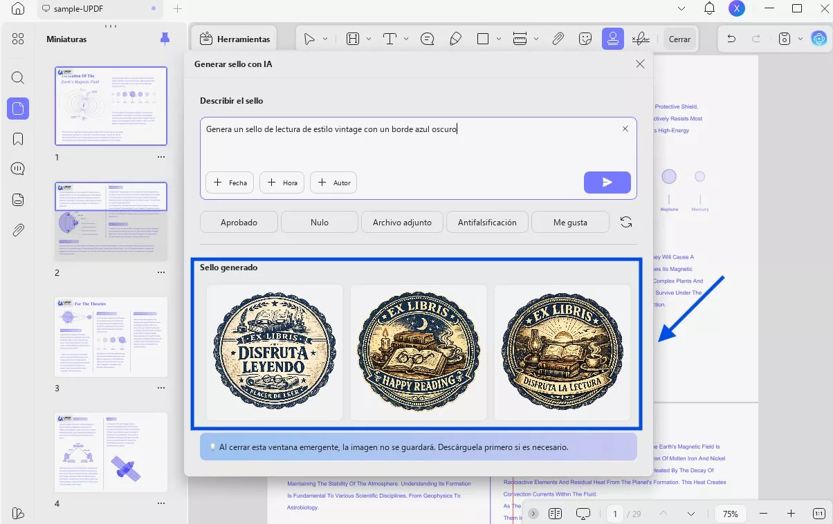 UPDF AI creará tres sellos PNG de alta resolución (1024 × 1024) con fondos transparentes basados en tu solicitud. Los encontrarás en la sección «Sellos generados».