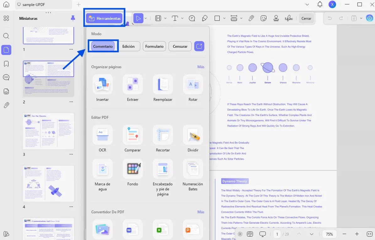 Paso 1. Abra el PDF deseado en UPDF. A continuación, haga clic en «Herramientas» en la parte superior y seleccione el modo «Comentario».
