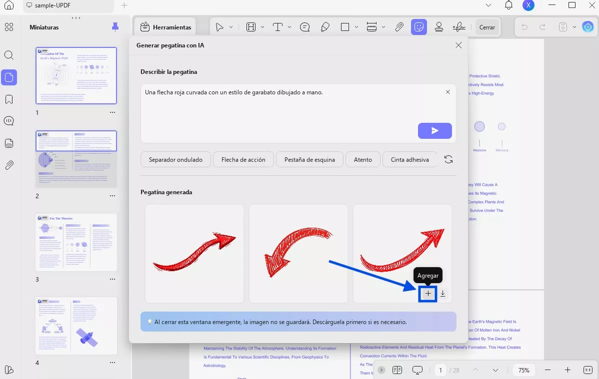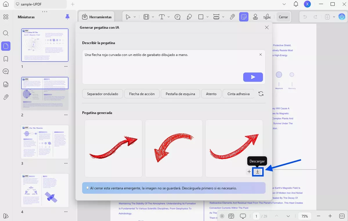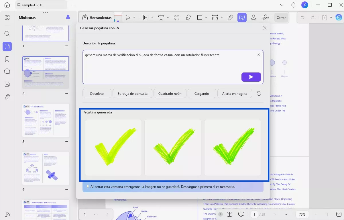 Tanto si personalizas tus indicaciones como si utilizas opciones preestablecidas, UPDF te permite colocar las pegatinas directamente en tu PDF. También puedes descargarlas para guardarlas y utilizarlas más adelante.