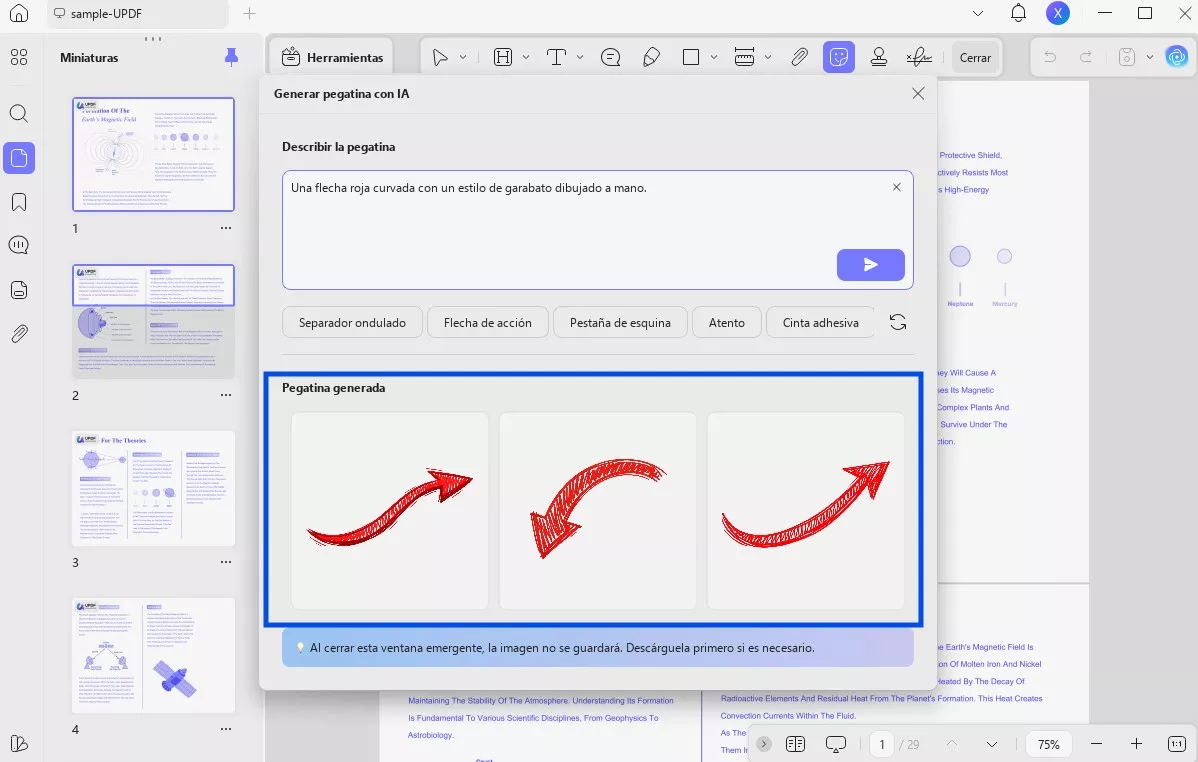 La herramienta Generar pegatinas con IA de UPDF te permite crear diseños de pegatinas totalmente nuevos desde cero. Solo necesitas una sencilla descripción de texto, que puedes escribir manualmente o utilizar las opciones de sugerencias preestablecidas para ahorrar tiempo. En cualquier caso, puedes generar tres imágenes de pegatinas de alta calidad a partir de una sola sugerencia.