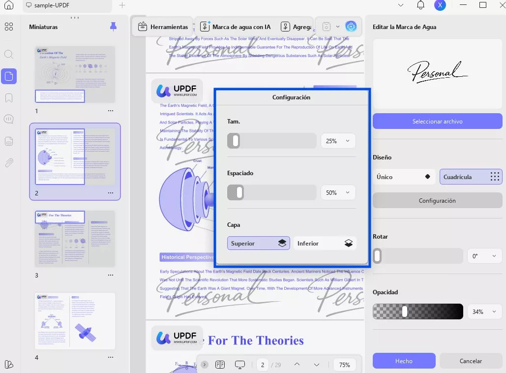 - Haga clic en «Configuración» para abrir un menú ampliado. Desde aquí, puede ajustar el tamaño y el espaciado de la marca de agua, y elegir si desea añadirla a la capa superior o inferior.