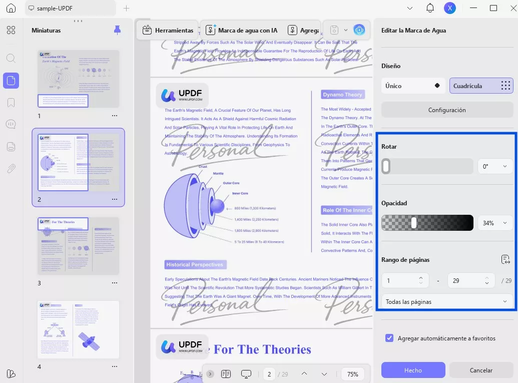 - Puede utilizar los controles deslizantes o el menú desplegable para ajustar la rotación y la opacidad de la marca de agua.