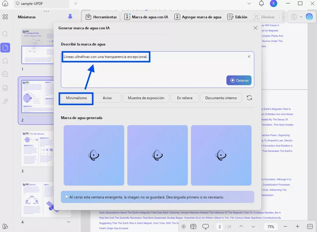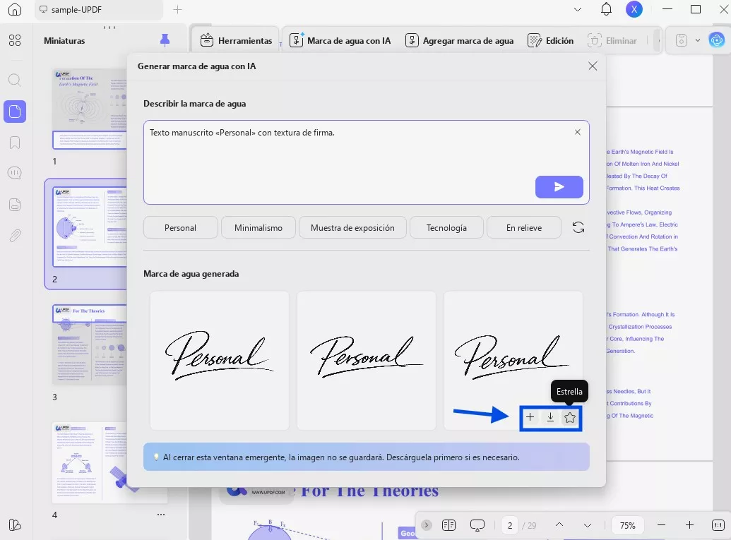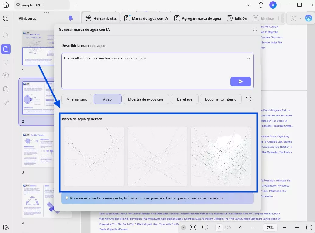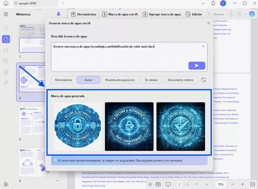 Paso 2. Basándose en tu descripción, UPDF AI generará tres imágenes PNG de alta resolución con marcas de agua y fondo transparente. Puedes verlas en la sección «Marcas de agua generadas».