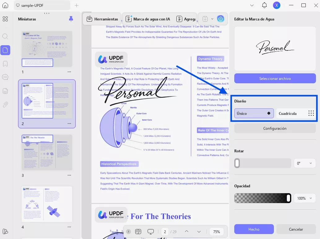 - En la sección Diseño, puedes cambiar la marca de agua de «Única» a «Cuadrícula».