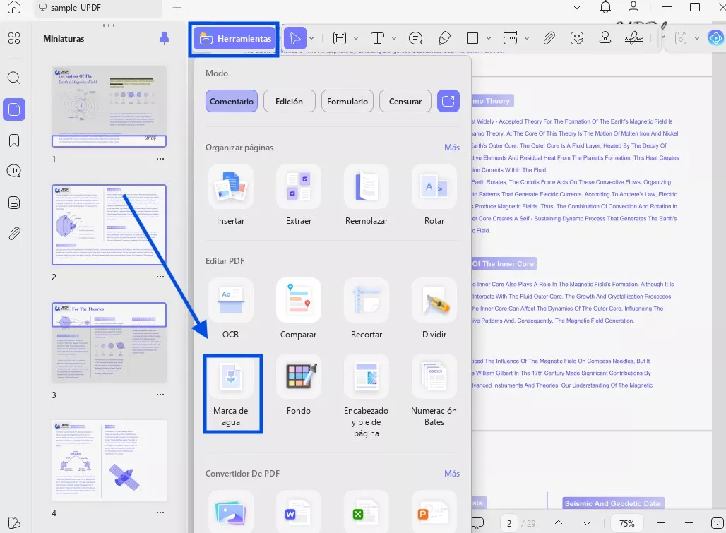 Paso 1. Abre el PDF al que deseas añadir una marca de agua en UPDF. A continuación, haz clic en «Herramientas» en la parte superior izquierda y selecciona «Marca de agua» en la sección Editar PDF.