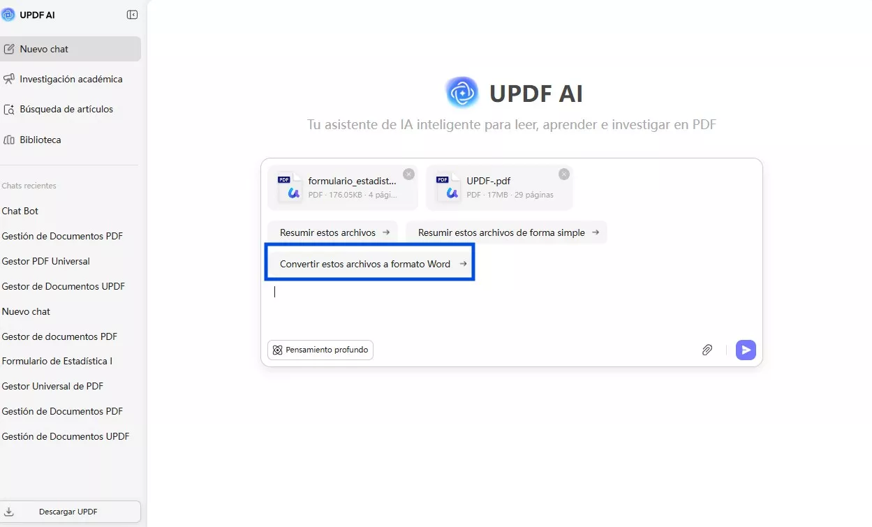 Opción 1. Convertir PDF a otros formatos en la sección «Chat»