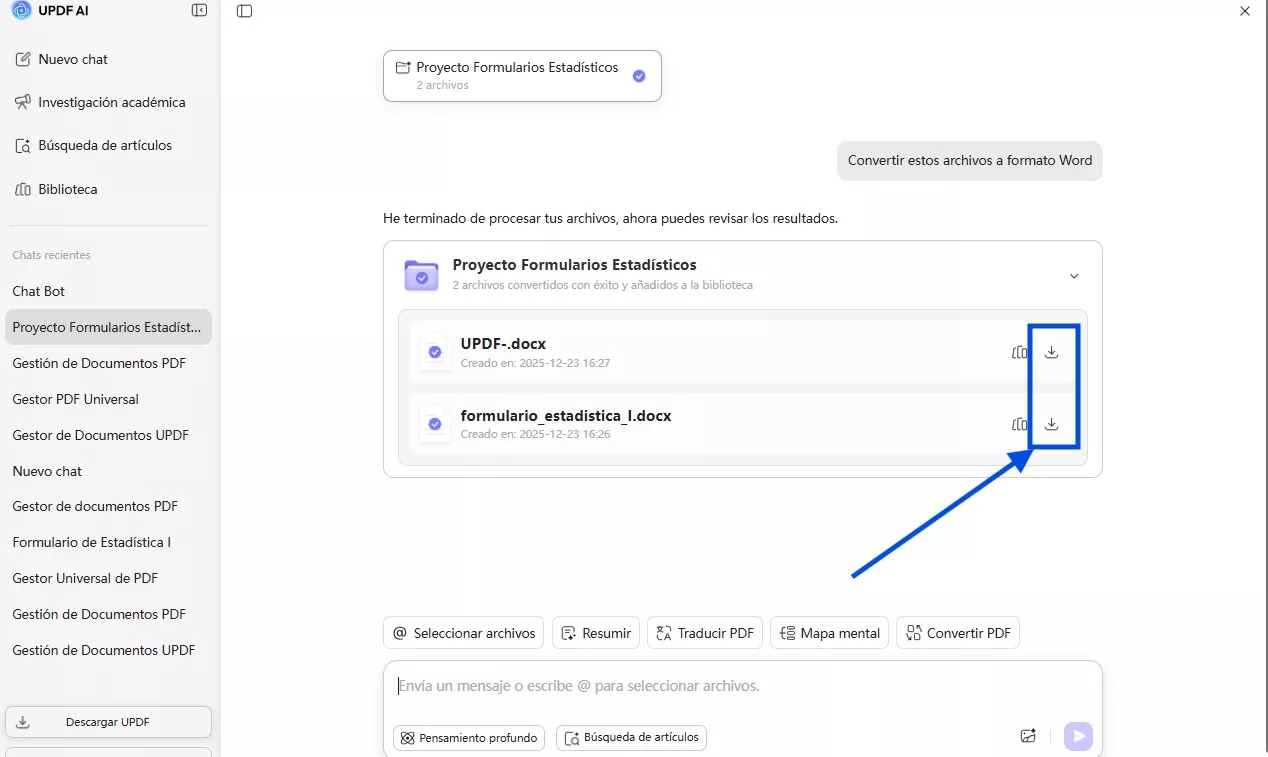 Paso 3. Ahora, UPDF AI te proporcionará el archivo convertido para su descarga. Solo tienes que pulsar el icono Descargar o seleccionar la opción Biblioteca para acceder a todos los documentos PDF convertidos.