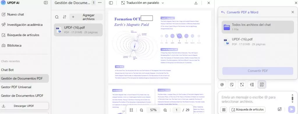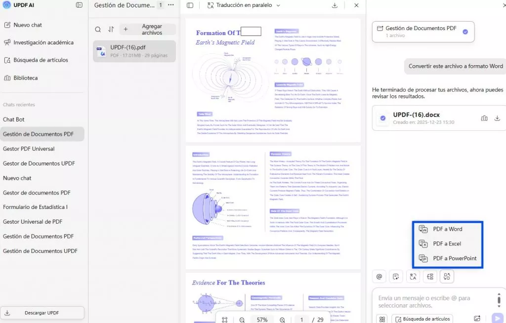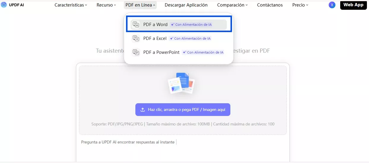 UPDF AI ahora te ofrece la opción de simplemente cargar los archivos PDF para convertirlos a cualquiera de los formatos que desees. Puedes utilizar su conversor de PDF en línea para transformar tus archivos en documentos de Word, Excel y Powerpoint. Para ello: