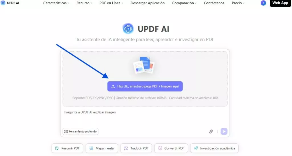 Paso 1. Para empezar, vaya a https://ai.updf.com/es o haga clic en el botón de abajo para abrir la interfaz Chat PDF de UPDF AI. Una vez allí, pulse el botón «Haga clic, arrastre o pegue aquí el PDF/imagen» para importar su documento PDF.