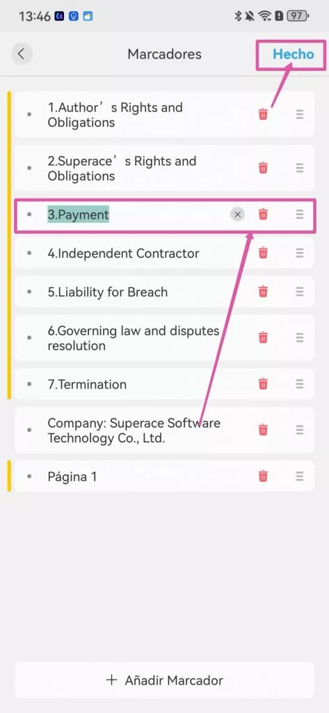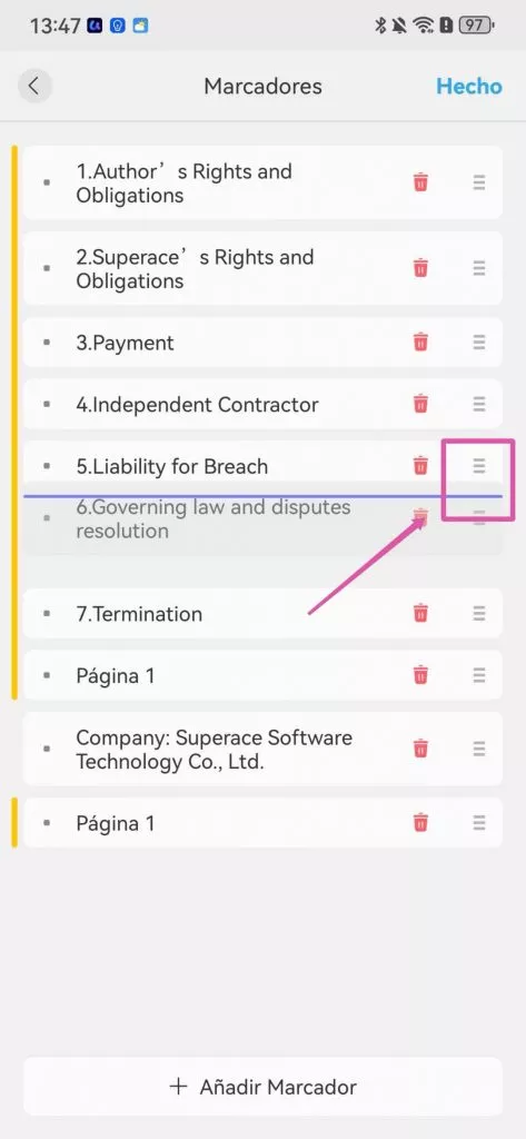 - Cuando toca el botón "Editar", UPDF también permite reorganizar los marcadores con una función de arrastrar y soltar manteniendo presionado el botón "≡".