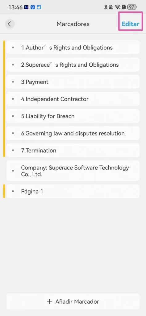 Con UPDF para Android, puede agregar marcadores a su PDF para facilitar el acceso. Admite agregar marcadores a PDF, cambiar el nombre de los marcadores agregados, arrastrar y soltar para reordenarlos y eliminarlos. ¡Ahora estás a solo unos toques de la página donde dejaste la lectura o donde se encuentra información importante!