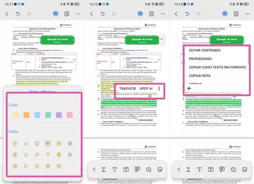 - Puede hacer clic en cualquier nota adhesiva que se haya agregado para realizar acciones adicionales, como traducir, usar UPDF AI, editar contenido, cambiar propiedades, arrastrarla para cambiar su posición, etc.