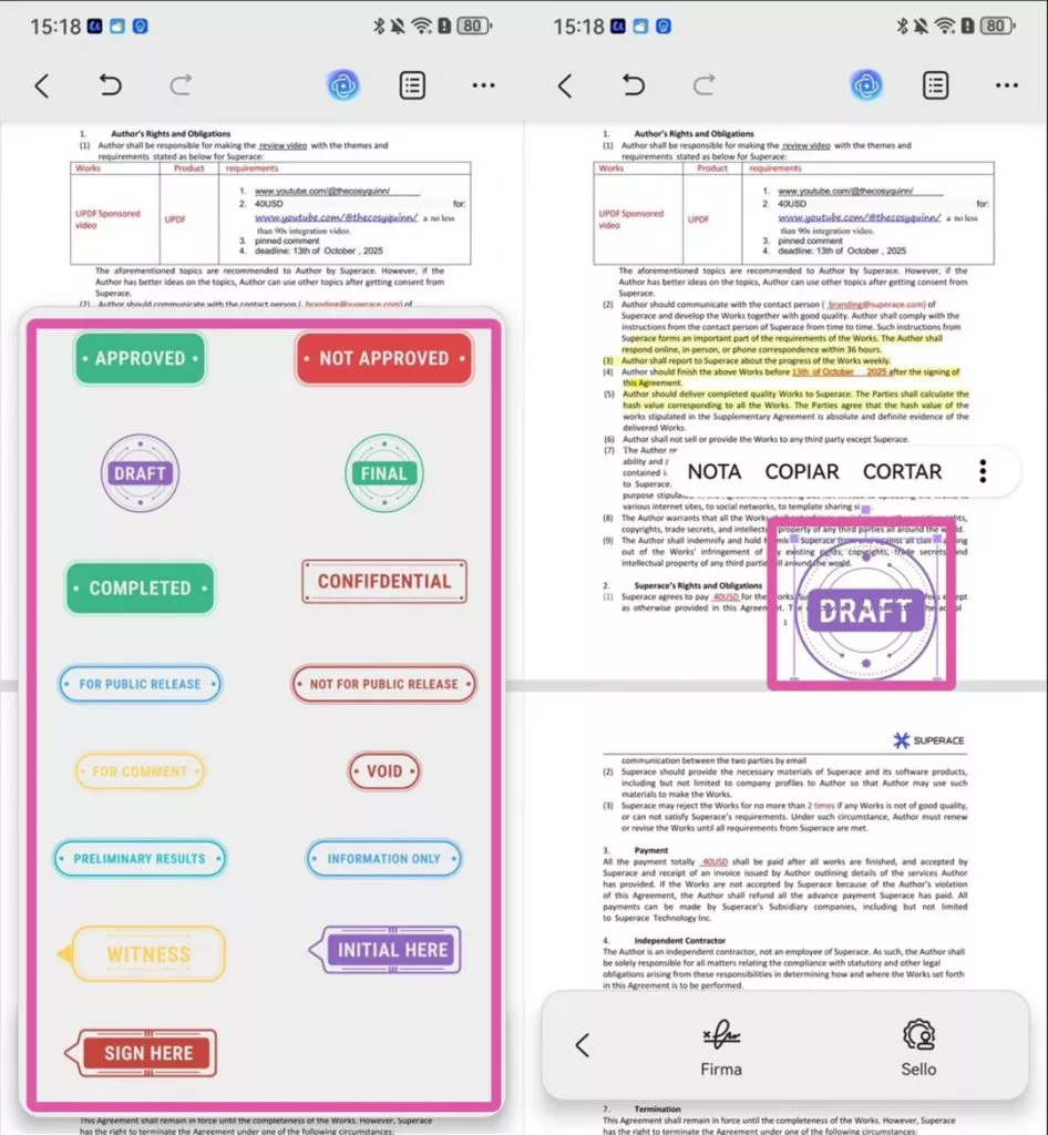 Puede hacer clic en cualquier sello que se haya agregado para realizar acciones adicionales, como copiar, cortar, eliminar o arrastrar para cambiar su posición.