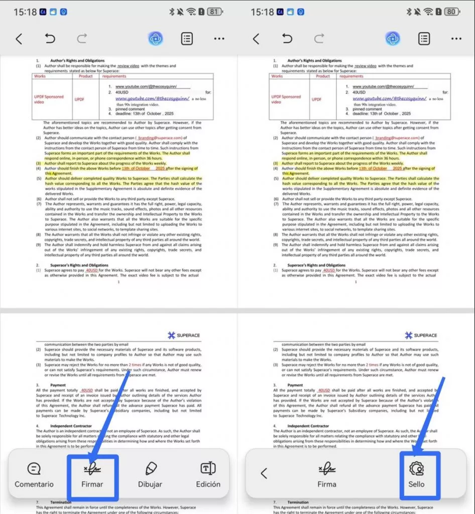 - Para agregar un sello a un documento PDF, haga clic en el ícono "Firmar" en la barra inferior de UPDF.