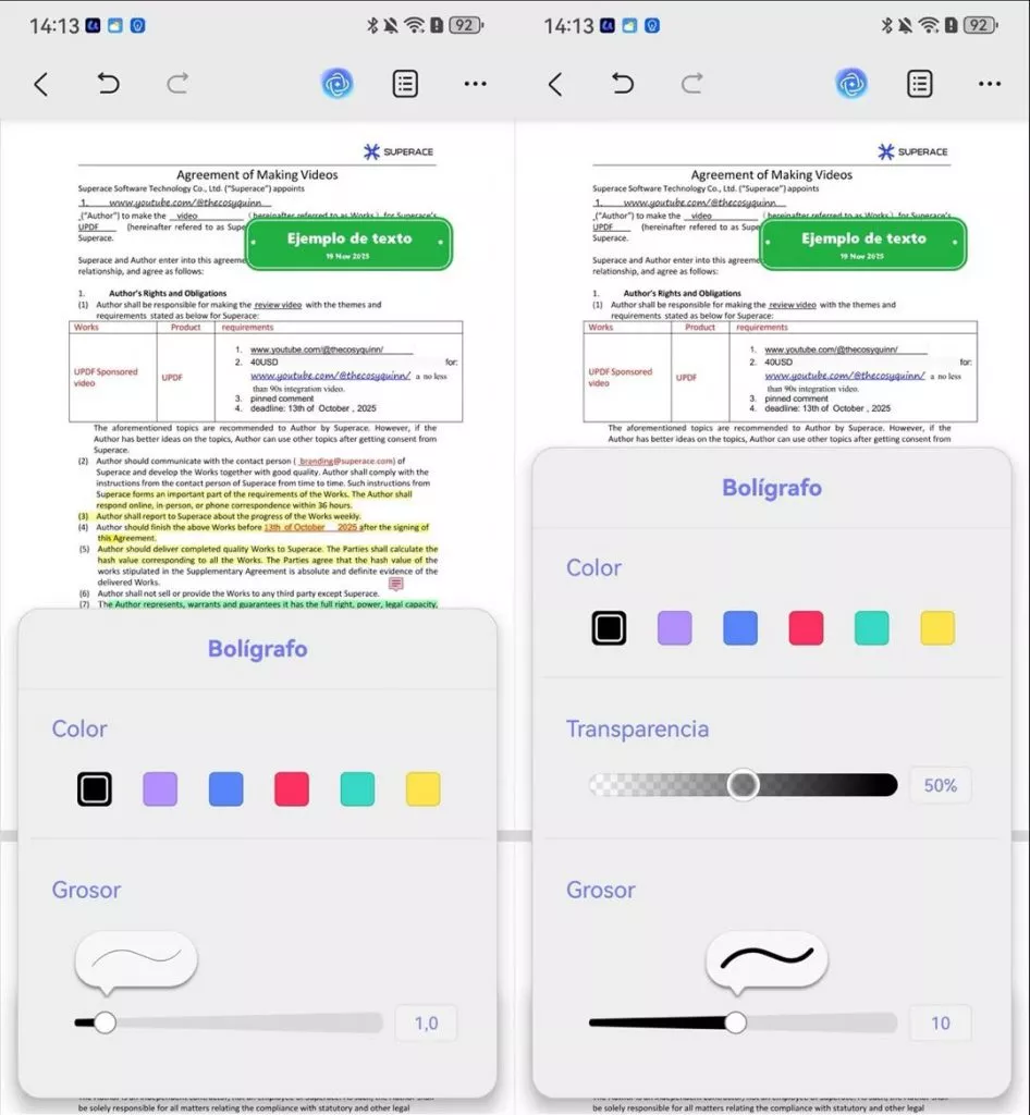 - Puede presionar la opción "Color" junto al símbolo "Lápiz" para seleccionar el color y grosor del lápiz de entre la gama de opciones disponibles. Puede presionar la opción "Color" junto al símbolo "Resaltador" para elegir el color, grosor y transparencia del resaltador.