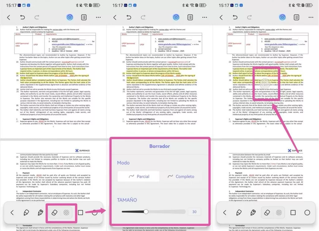 - Si desea borrar las marcas de lápiz o resaltador, seleccione el ícono "Borrador" y haga clic en el botón transparente junto a él. Luego, elija el modo de borrador —ya sea "Parcial" o "Completo"— y seleccione el tamaño del borrador. Ahora, puede deslizar el dedo sobre la pantalla para borrar.
