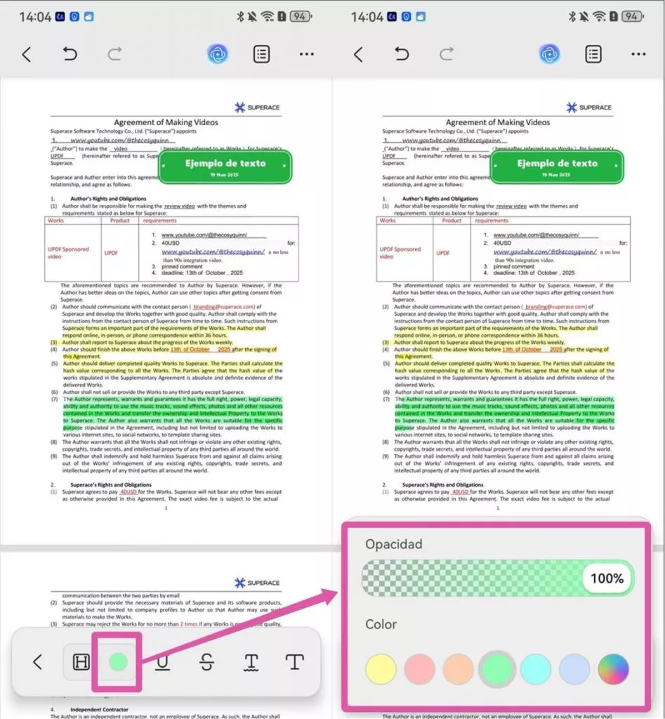 - Seleccione la opción "Resaltar" y simplemente desplace el cursor sobre el texto para resaltarlo. También puede presionar la opción "Color" junto al icono de "Resaltar" para elegir un color de pincel y ajustar la opacidad del pincel.